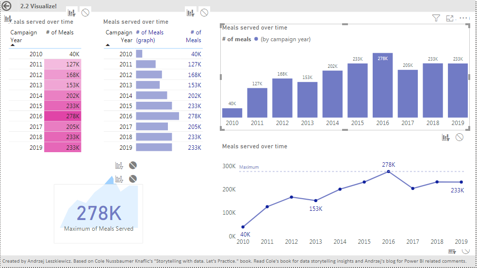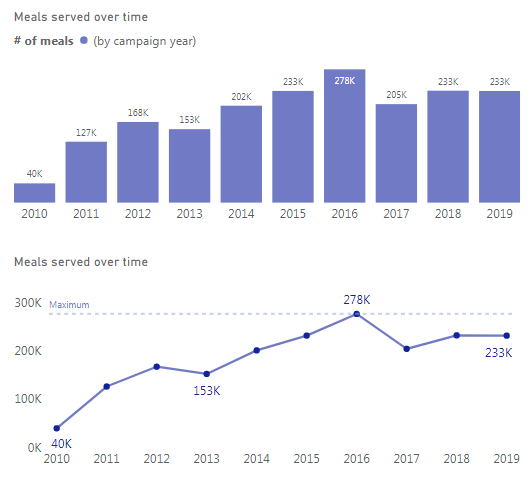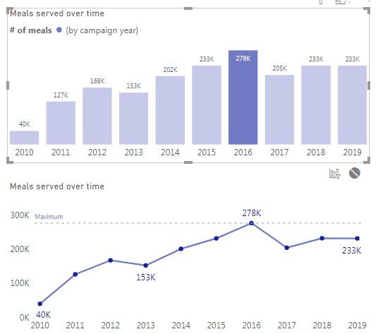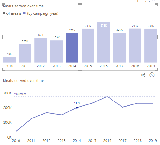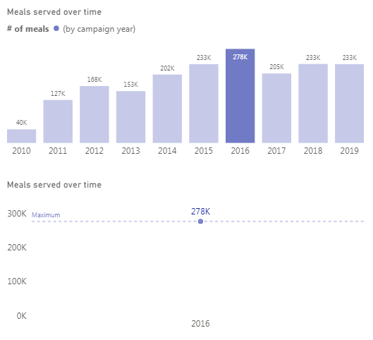 And this measure returns number of meals served only for ‘2-2 Years'[Campaign Years] year that is equal to the selected ‘2-2′[Campaign Years] year.