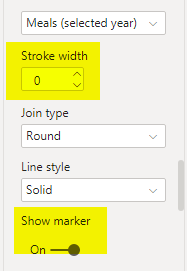 Then I opened Shapes formatting options, enabled Customize series and for ‘Meals (selected year’ measure I disabled the line (stroke width = 0) and enabled marker:
