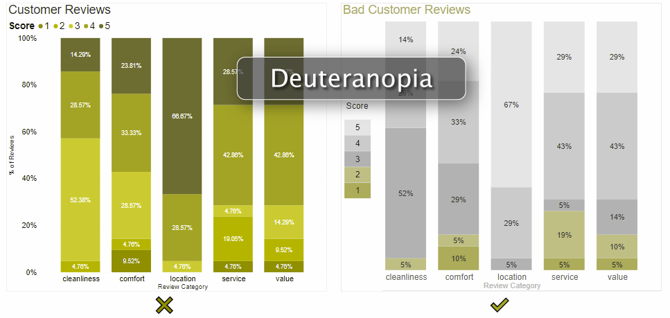 Chart on the right allows you to focus your analysis on bad or good reviews and works well for color blind people.
