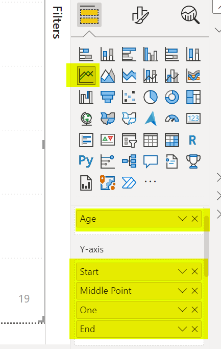 Next step is to add a native Line chart visual with ‘Age'[Age] column to X-axis field and multiple measures to Y-axis field.