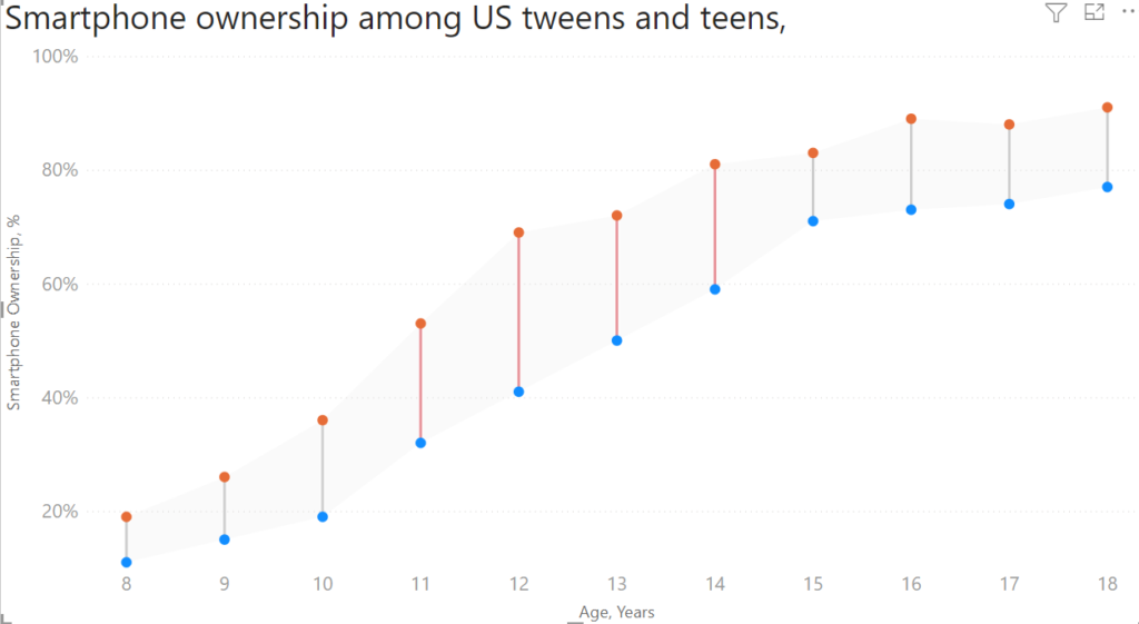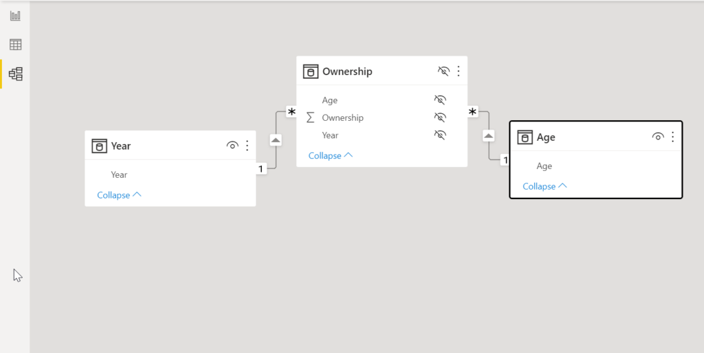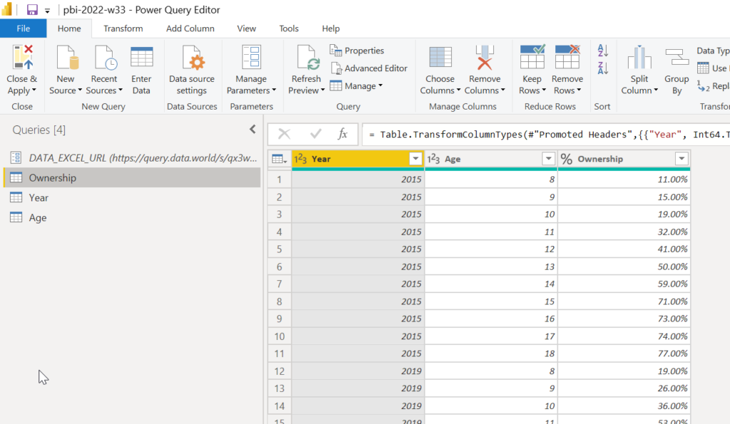 I loaded data into Power Query (a simple and short fact table with Year, Age and Ownership columns) + Year and Age dimension tables. Yeah, a proper star schema even for a very simple one chart report. It takes just a minute to build (with so simple fact table), but I think it’s a good habit.