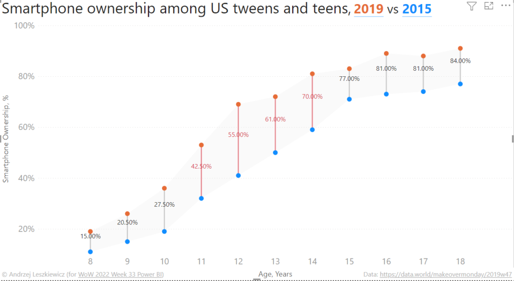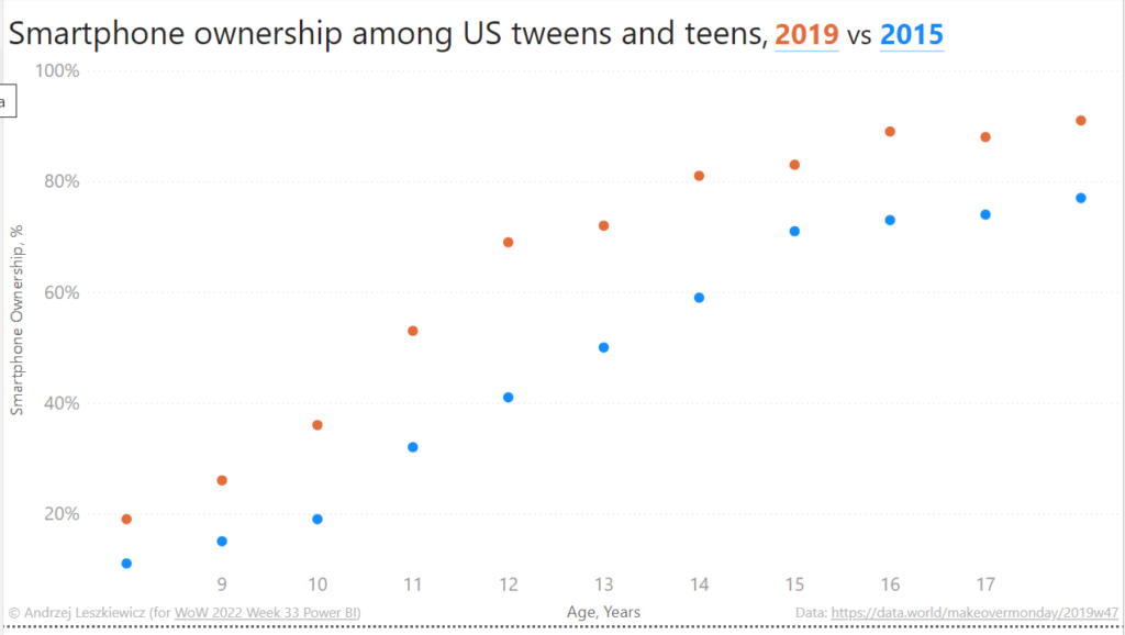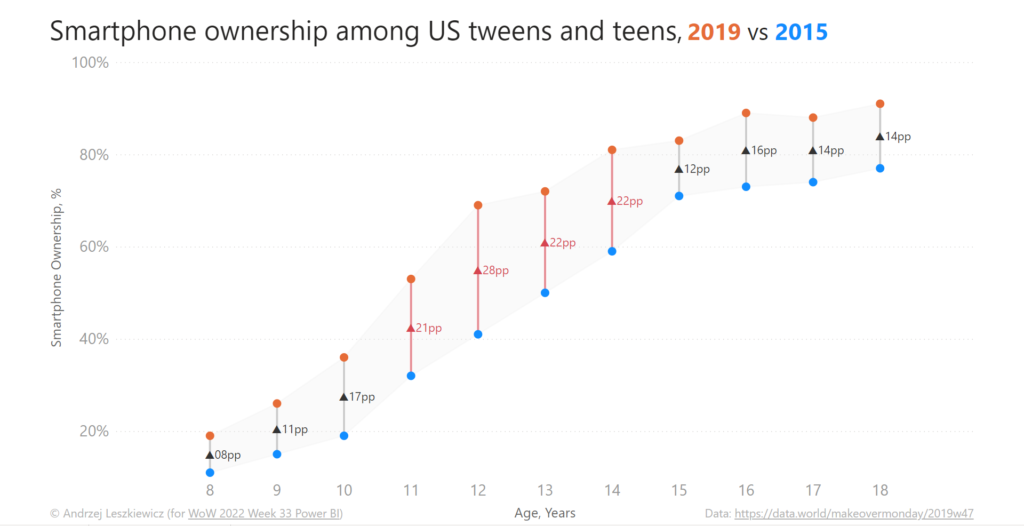 Then I formatted Axis X, Axis Y, added a title and a text box with “2019 vs 2015” text, a few foot notes and it’s complete.