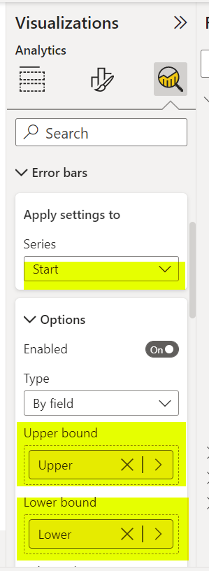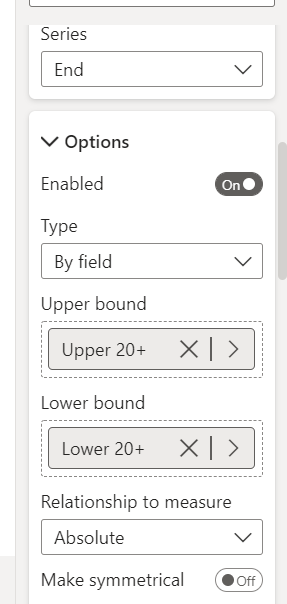 And I added [Upper 20+] and [Lower 20+] measures to the [End] series and formatted the error bars as red bars (lines):