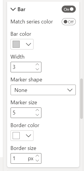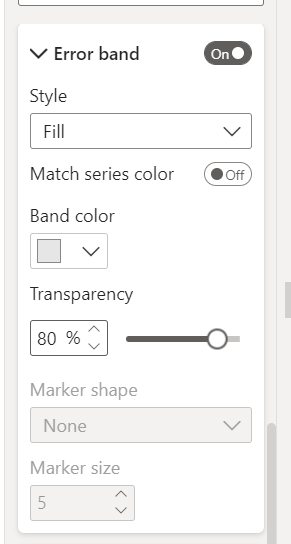 I added [Upper] and [Lower] measures to the [Start] series and formatted the error bars as gray bars (lines) with gray semi-transparent error band: