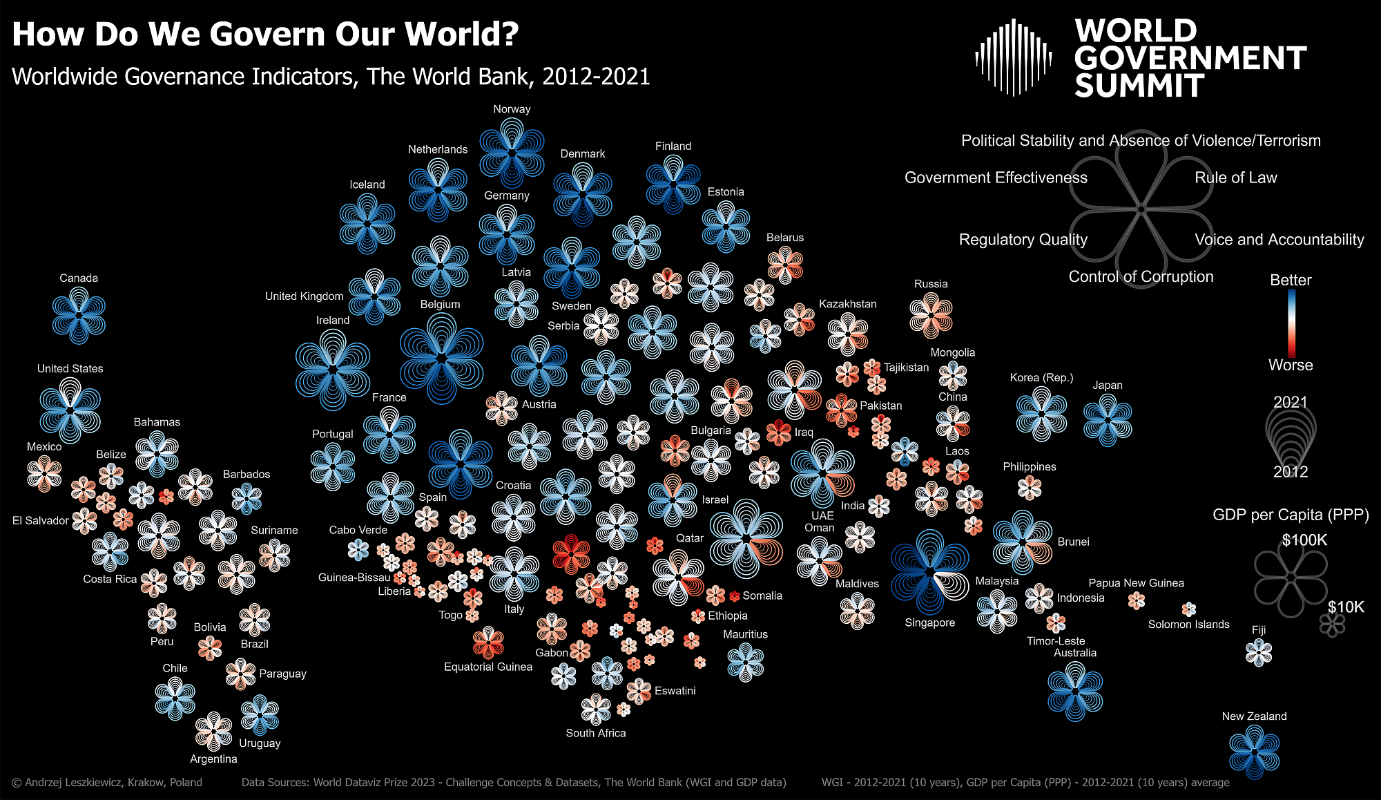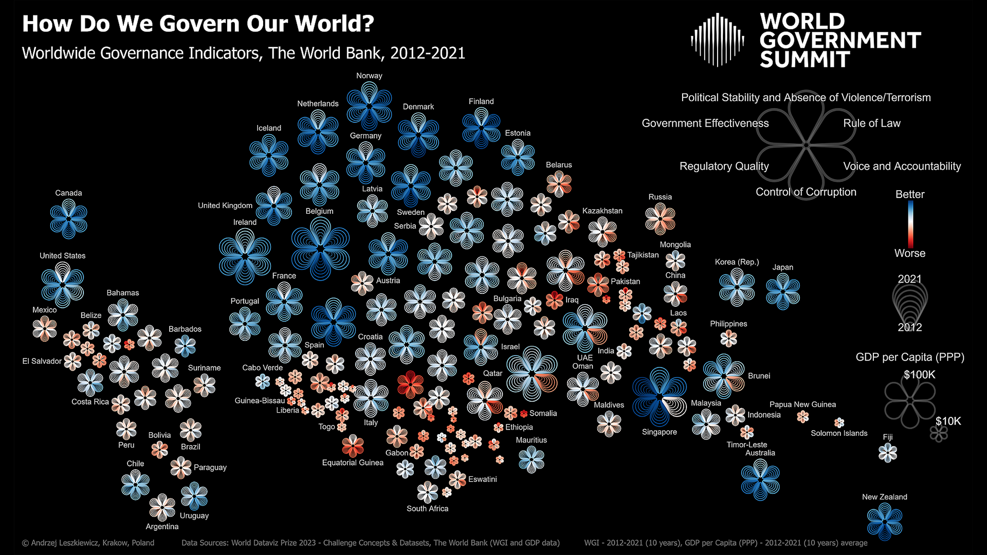 The poster displays Worldwide Governance Indicators for 170 countries. Each flower represents a country. A flower has 6 petals that represent 6 different indicators. Each petals combines 10 colored arcs to encode 10 years of data. Red-white-blue color scheme encodes indicator values from -2.5 to +2.5 with higher values corresponding to better governance.