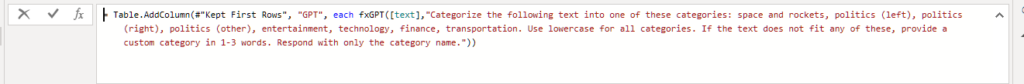 = Table.AddColumn(#"Kept First Rows", each fxGPT( [Tweet Text], "Categorize the following text into one of these categories: space and rockets, politics (left), politics (right), politics (other), entertainment, technology, finance, transportation. Use lowercase for all categories. If the text does not fit any of these, provide a custom category in 1-3 words. Respond with only the category name."))