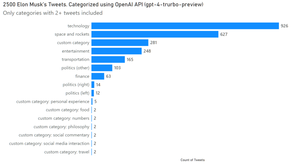 The first attempt was successful; I categorized the first 2,500 tweets. The next step is to write a more detailed and optimized prompt based on the results of the first test. For example, I don’t like that useless “custom category” and I would like to merge some small categories that were excluded from the chart.