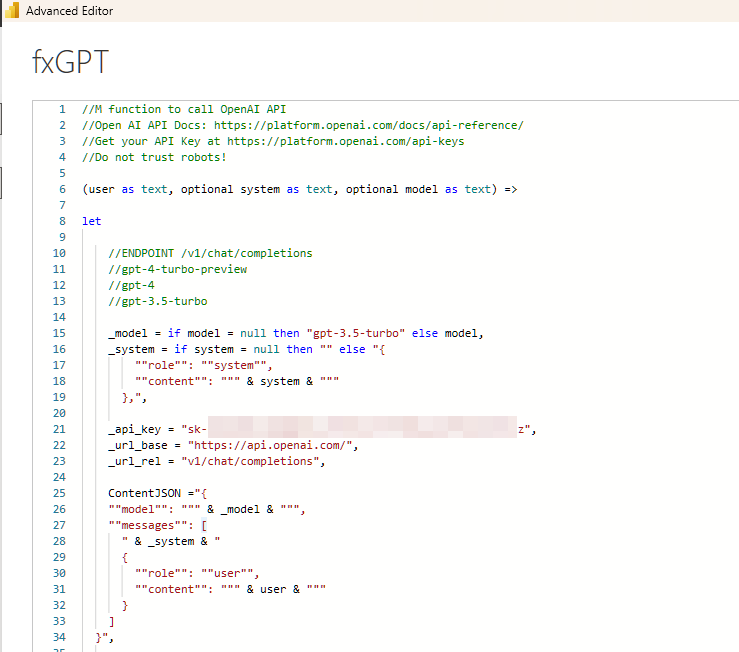 First, I updated the M function fxOpenAI in my GitHub repository to make it compatible with the current version of OpenAI. It’s a basic template function for using OpenAI (GPT) in Power Query that accepts only the most important parameters.