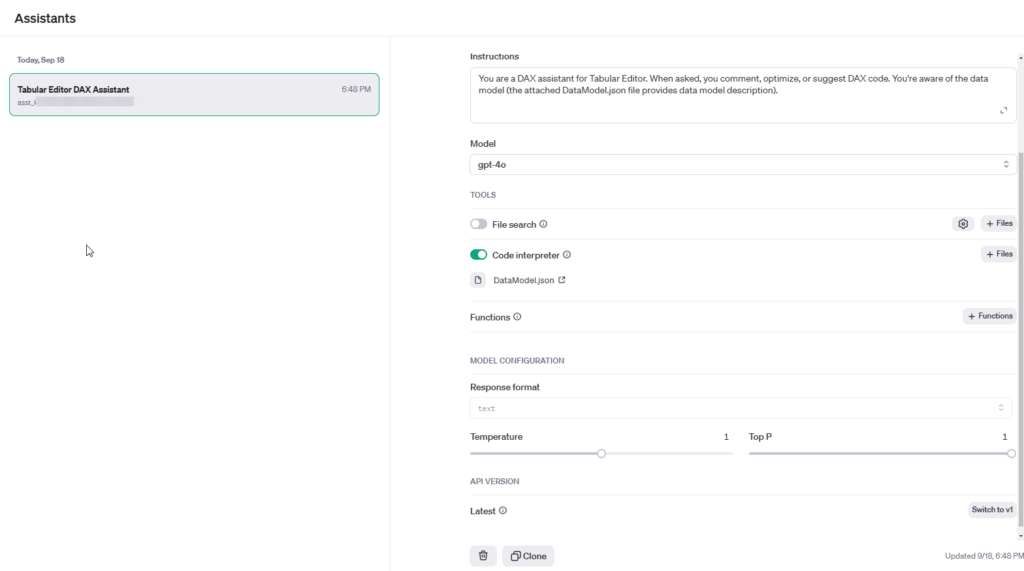 Once an assistant created, you can use ai-comment-measure.csx script multiple times with the same data model. It’s OK to close Tabular Editor and .PBIX file and reopen them later. The assistant exists permanently (until deleted) on the Open AI server.