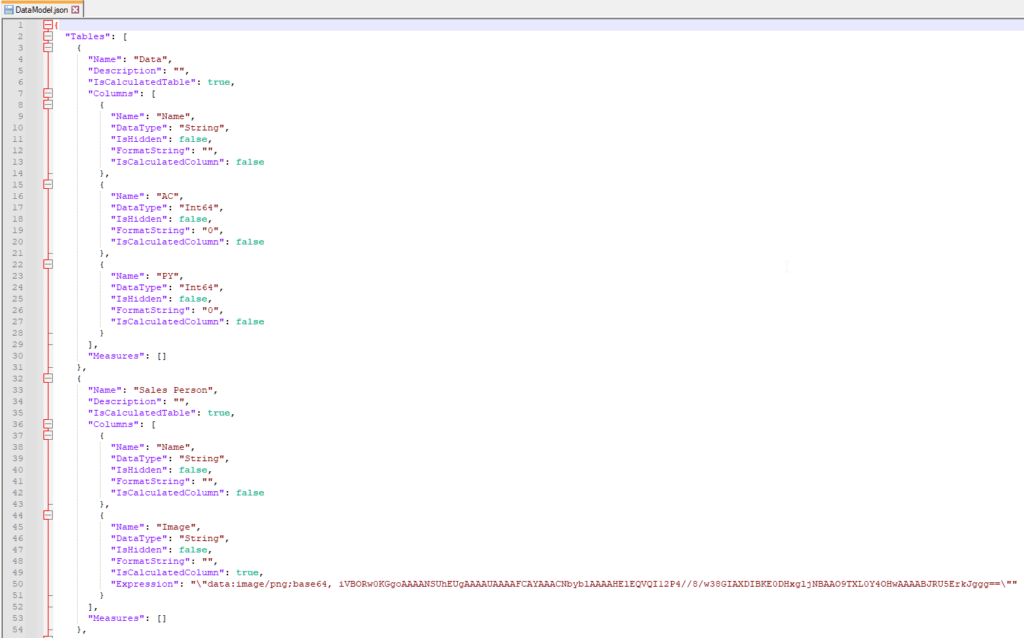 I can’t export the data model as .BIM due to TE3 Desktop subscription limitations, but the script generates a simple JSON containing some details about the data model, including tables, columns, measures, and relationships.