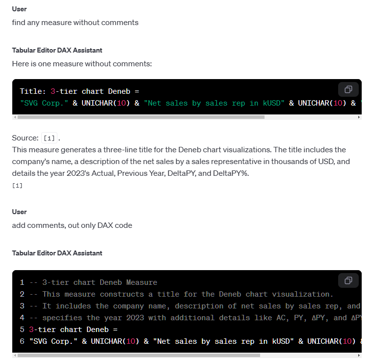 For now, this is just a quick proof of concept, but it works (at least it worked on my side). It consists of two C# scripts: one script creates an assistant with an attached data model description (in JSON format), and the other script adds comments to a copy of the selected measure using the assistant.