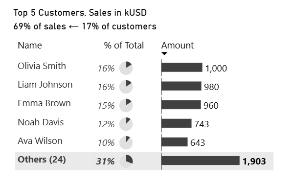 Using this filter, we calculate the number of customers in “Others,” the sales amount for those customers, and their percentage of the total.