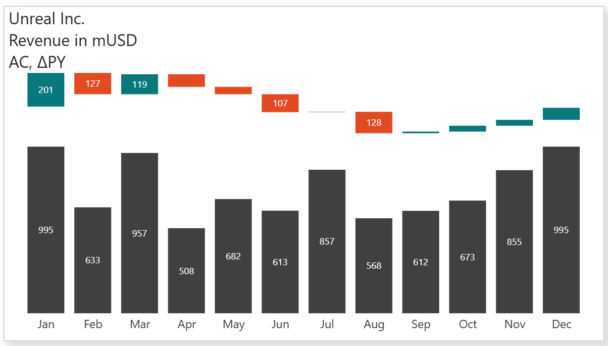 Prompts were intentionally short and lazy, without much detail, without telling AI what methods to use, and without telling it to fix all issues in one longer prompt, with the purpose of better testing AI reasoning. All calculations and measures required to build the waterfall (e.g., invisible bars for proper waterfall positioning) were 100% AI. I just told it to add white space between AC and the waterfall for proper positioning and to make sure the waterfall bar begins where the previous bar ended. There was no goal to reproduce the original chart as is; I deliberately asked it to build a waterfall instead of simple variance bars.